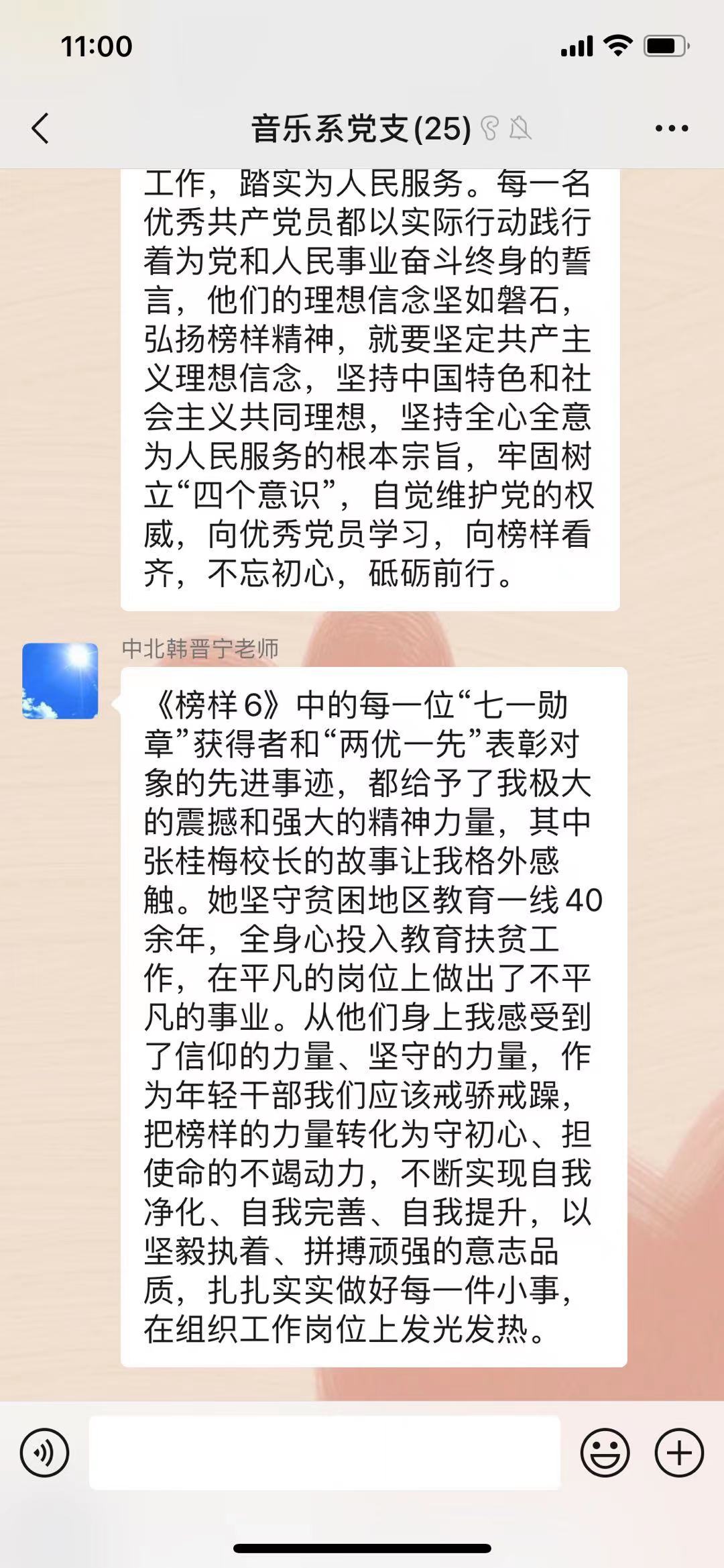 通过观看《榜样6》,全体党员干部都受到了极大的鼓舞,榜样们的事迹为大家树立了干事创业的标尺,为党的事业注入了正能量,大家表示:要向榜样看齐,牢记党的宗旨,加强党性锻炼,提高能力素质,强化自身学习,树立正确的价值观,不忘初心,牢记使命,在本职岗位上尽职尽责,用实际行动诠释榜样精神,为推动学院发展贡献力量。