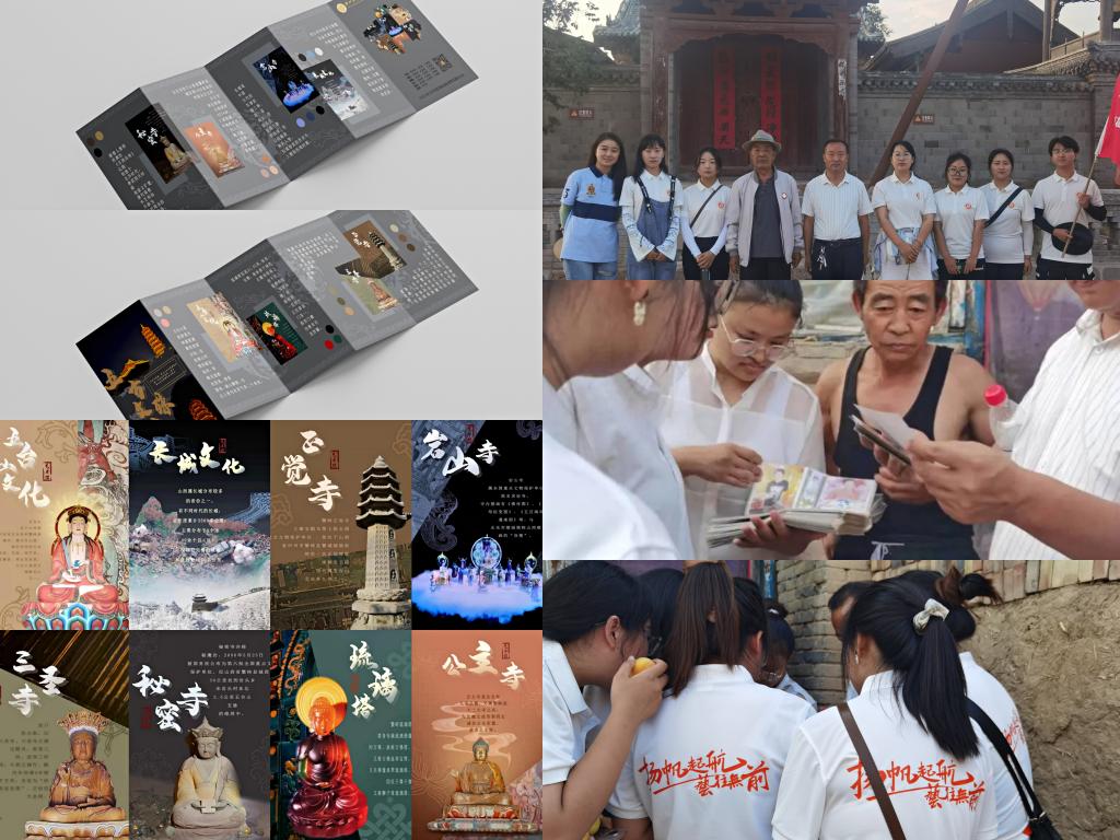 在负责老师的带领下,小组成员围绕每一处文物古迹的特点,辅以忍冬纹、盘长结、祥云纹、莲花纹、象纹、宝器纹等传统纹饰元素,展开海报的创作设计。在大家的齐心协作下,绘制了以憨山文化园中五方文殊塔所列:五台山文化、琉璃塔、正觉寺、三圣寺、秘密寺、公主寺、长城文化、岩山寺等8处文化古迹为主的系列海报8张,对应艺术馆每一层的文物收藏,并设计制作成5折页作为旅游导览手册。
