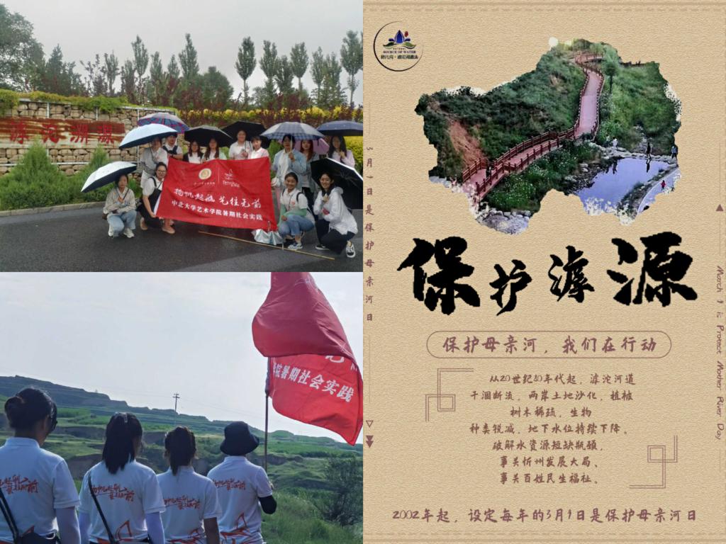 与此同时,在调查与探访中实践队了解到现阶段滹沱河流域全域污染,虽上游(山西境内)污染程度较轻,但部分排污已造成耕地欠收绝收,居民饮用水质量大幅下降,保护河流迫在眉睫。队员们深知绿水青山就是金山银山,他们肩负责任带着保护滹沱生态的信念,利用自己的一技之长来努力为保护河流生态贡献一份力。在支教的课堂中教员们结合课堂内容引入滹沱文化并呼吁大家从我做起“随手怕、随手捡、随手护”用微行动一起保护母亲河;设计小分队利用平面设计专长,巧妙设计海报融入滹沱文化和朗朗上口的宣传语,引导大家增强意识、规范行为树立良好的生态文明建设观。