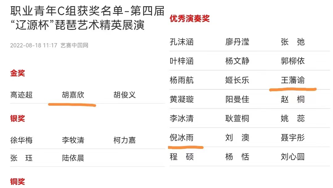琵琶专业研究生胡嘉欣荣获金奖、张煜晗荣获铜奖,倪冰雨和本科生王藩钰荣获优秀奖,田军教授荣获优秀指导教师奖。
