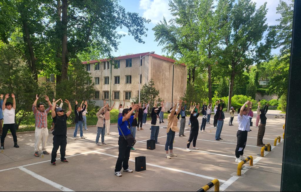 党委工会组织教师运动员们齐聚运动场举办运动会热身活动。