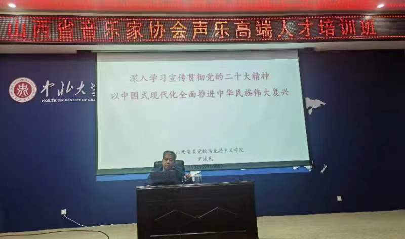 山西省委党校马克思主义学院副院长、尹诚民教授带领全体学员,“深入学习宣传贯彻党的二十大精神以中国式现代化全面推进中华民族伟大复兴”。之后,四川音乐学院党委常委、副院长谭学胜教授对在场的学员进行“一对一”细致的辅导。谭教授的声乐教学理念,以及精湛的个人示范,深深地触动了每一位学员。