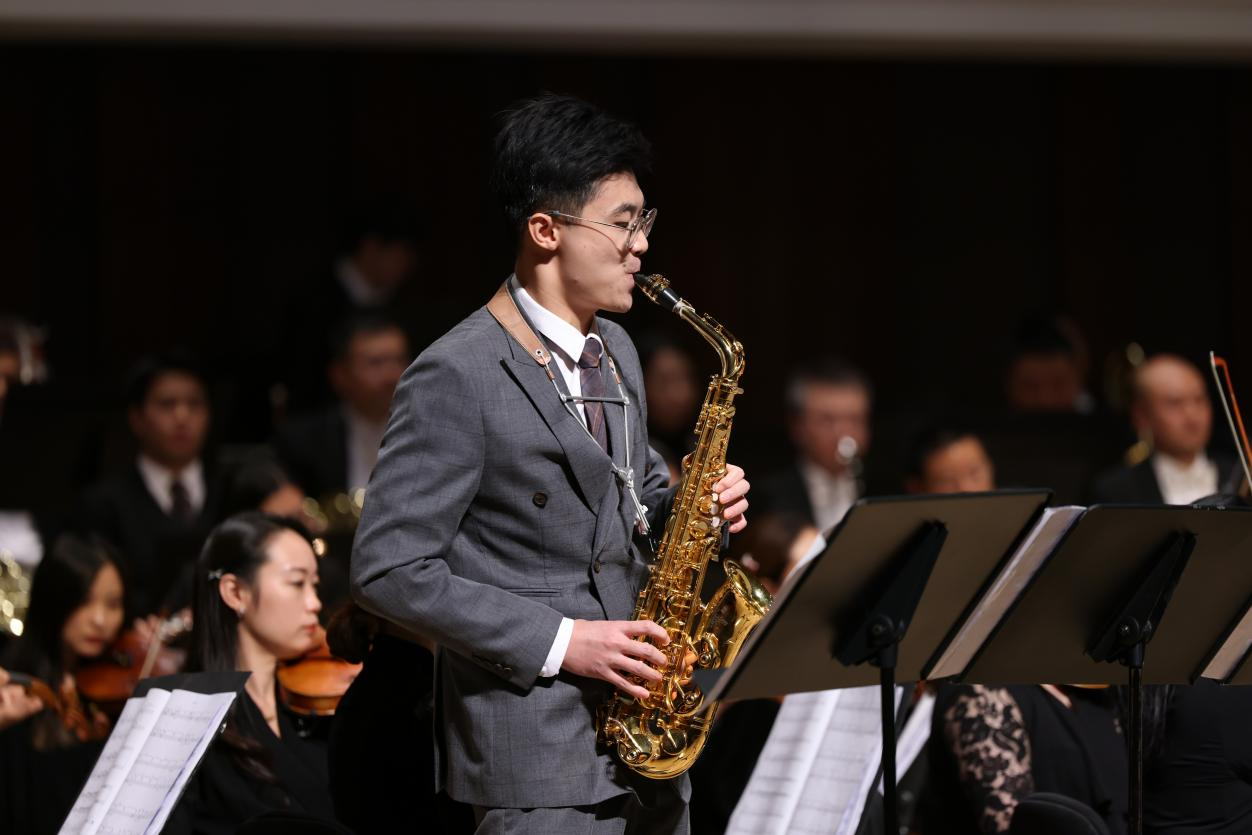 青年教师张记晨博士受邀参加开幕式音乐会,与陕西交响乐团合作演出《太阳鸟的无穷动》(由四川音乐学院作曲系郭元教授为中音萨克斯管与交响乐团创作)。作品以十六分音符音型、震音式的音型为主要音响,以此来表现太阳鸟飞翔的状态。乐队以支声复调方式变化重复独奏萨克斯管的音型,模糊了音乐线条,虚化了音响轮廓,宛如伴随太阳鸟飞翔过程中产生的重重玄影和串串印迹,刻画出太阳鸟对太阳永不停息的追寻。音乐中对于中音萨克斯管复音、超吹等非传统技巧的运用,将乐器丰富的音色表现力展现得淋漓尽致,给人以耳目一新的听觉体验,萨克斯管极高音区强有力的长音,像一只扶摇怒冲而上的太阳鸟,一声竭力的嘶鸣划破天际,画面感很强,给人留下深刻印象。