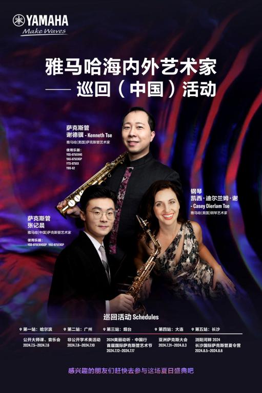 2024年暑期,张记晨博士受邀参与雅马哈公司主办的海内外艺术家中国巡演,与来自美国的萨克斯艺术家Kenneth Tse和钢琴艺术家Casey Dierlam Tse一同在哈尔滨、广州、肇庆、烟台、大连、长沙等多个城市进行音乐会演出及公开课。此次巡演不仅促进了国内外音乐家的学术交流,还进一步提升了偷拍av