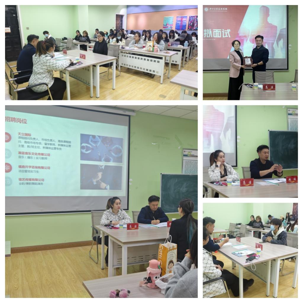课堂上,任课教师郭云霞介绍本次课程的目的意义,简要介绍了两位校友的发展经历。随后一场精彩的面试开启,两位校友带来四家招聘企业的岗位。王振婷同学作为应聘者从着装、应聘礼仪、沉着对答,面试官结构化问题、非结构化问题、情景问题及压力问题是步步为营,整场面试历经半个多小时,台上时而轻松时而紧张,完美呈现了真实的面试场景。台下观众也是聚精会神认真观看。面试结束,两位校友细细点评了面试中每个问题的目的、应聘者回答的满意程度及其表现出的问题。另外,在互动环节中,校友针对学生提出的创业、传媒行业入行等困惑,剖析行业趋势,鼓励学生提前规划、主动实践。