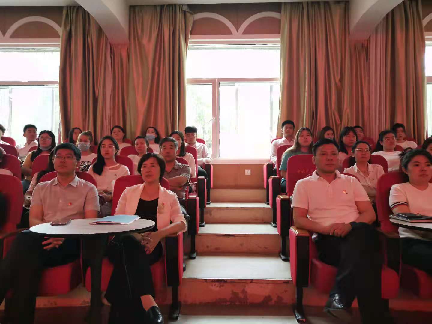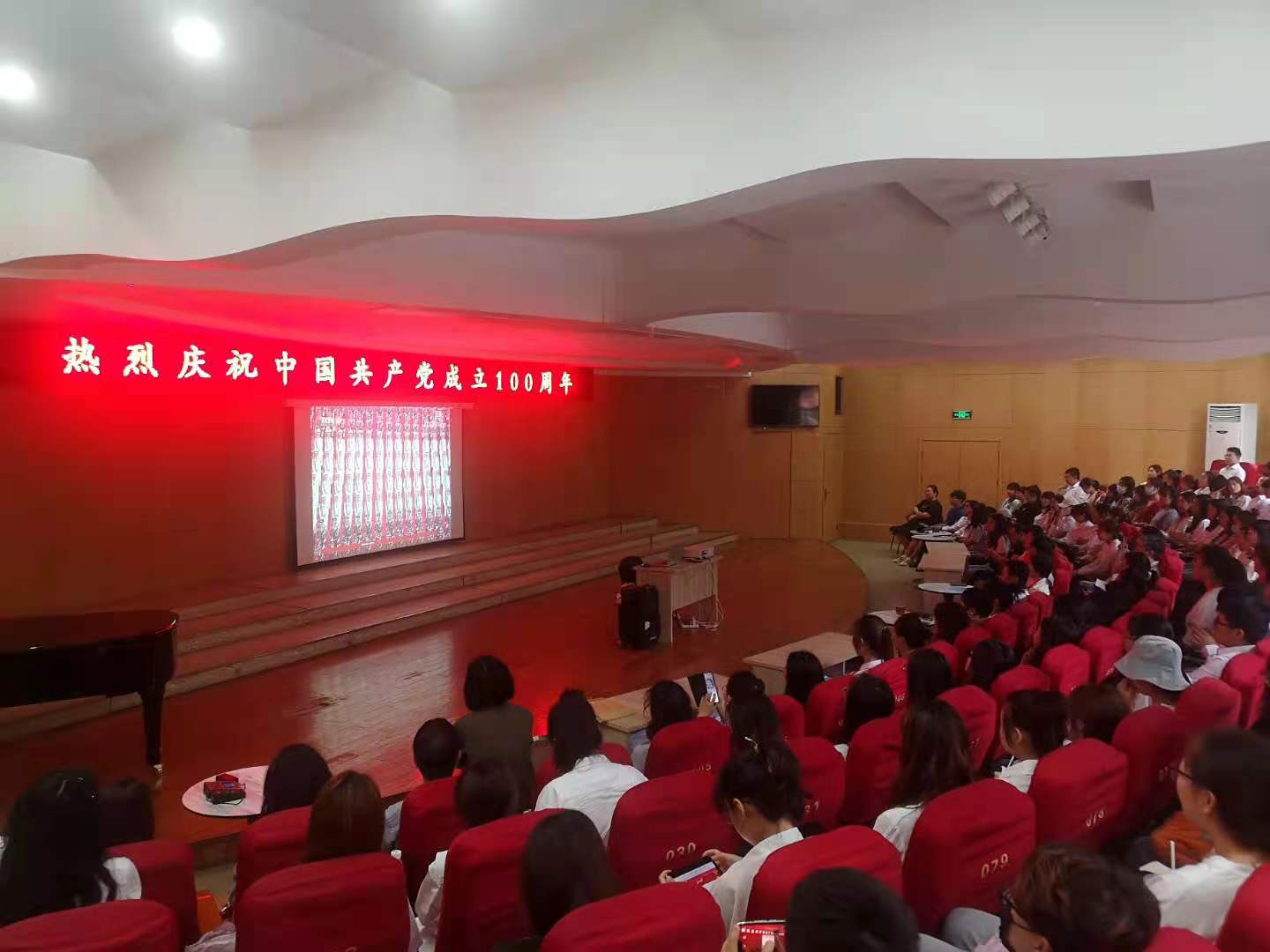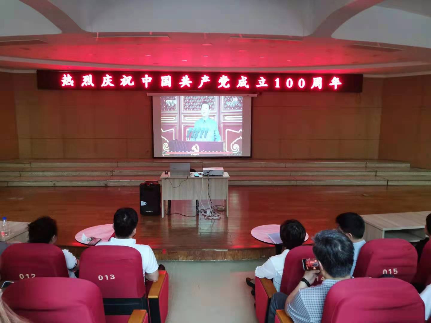 党委组织全体教职工和在校学生在12号楼一层东厅观看现场直播。学院党委书记夏瑞丽、院长王燕平、副书记田维飞、院党委委员、各科室主任、支部书记等到场一同观看庆祝大会。