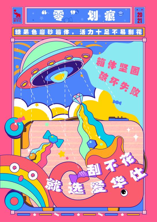 考虑到糖果箱是为新生代群体打造的,在设计时,将爱华仕作为主人公,以两个故事进行讲述,一个故事加入了年轻人物形象代表新生代群体,上方星系代表世界,并将我们所熟知的俄罗斯方块游戏与世界性标志建筑物、服饰等进行结合,意在表现箱体很能装,突出产品的实用性。另一个将飞船作为破坏箱体的反派角色置于画面中,表现受到攻击的箱体没有受到破坏,强调产品的坚固性。最后邀请消费者一同创造属于自己的故事为设计思路。