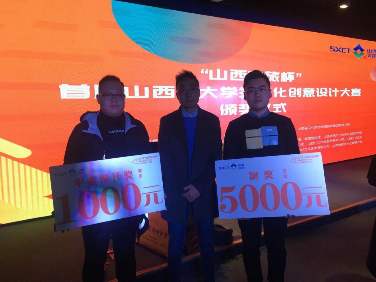 2019年11月15日下午,由山西省教育厅、山西省文化和旅游厅、共青团山西省委员会、山西广播电视台、山西省文化旅游投资控股集团有限公司联合主办,山西文旅集团所属三晋文化旅游集团有限公司承办,故宫文创、保利文创等单位联合协办的“山西文旅杯”首届山西省大学生文化创意设计大赛在山西文旅集团数字体验馆云厅举行了盛大的颁奖仪式。我院研究生韩伟、管志杰同学获得平面设计奖及铜奖,其设计作品在现场展出,展示了我院师生在服务当地经济文化中的精神风采。