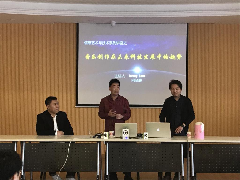 12号教学楼12301H举行了信息艺术与技术系列讲座之---音乐创作在未来科技发展中的趋势。主讲人是来自新加坡的音乐制作人Jermy Lum和毕业于中央音乐学院的音乐人向晓春。Jemmy作为新加坡先锋乐派代表人物,在华人乐坛及东南亚极具影响力,曾制作张艺谋导演的电影《英雄》的预告片音乐制作,与港台多位知名艺人合作创作出众多经典音乐。Jemmy通过分享创作经验,讲述了目前东南亚、好莱坞运用的现代音乐创作手法、音乐科技发展趋势;音乐人向晓春主要谈到如何运用作曲技术创作电子音乐,展示了个人创作的部分音乐作品。讲座后,两位音乐制作人解答了在场同学关于电子音乐制作的疑问。