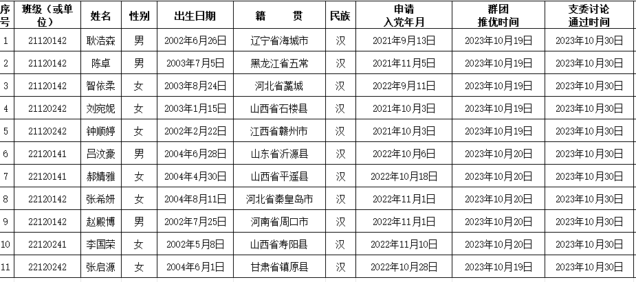 本科生第一党支部于2023年10月30日晚召开了支部大会,应到会正式党员4人,实到4人,经票决一致同意确定智依柔等11名同志为入党积极分子。