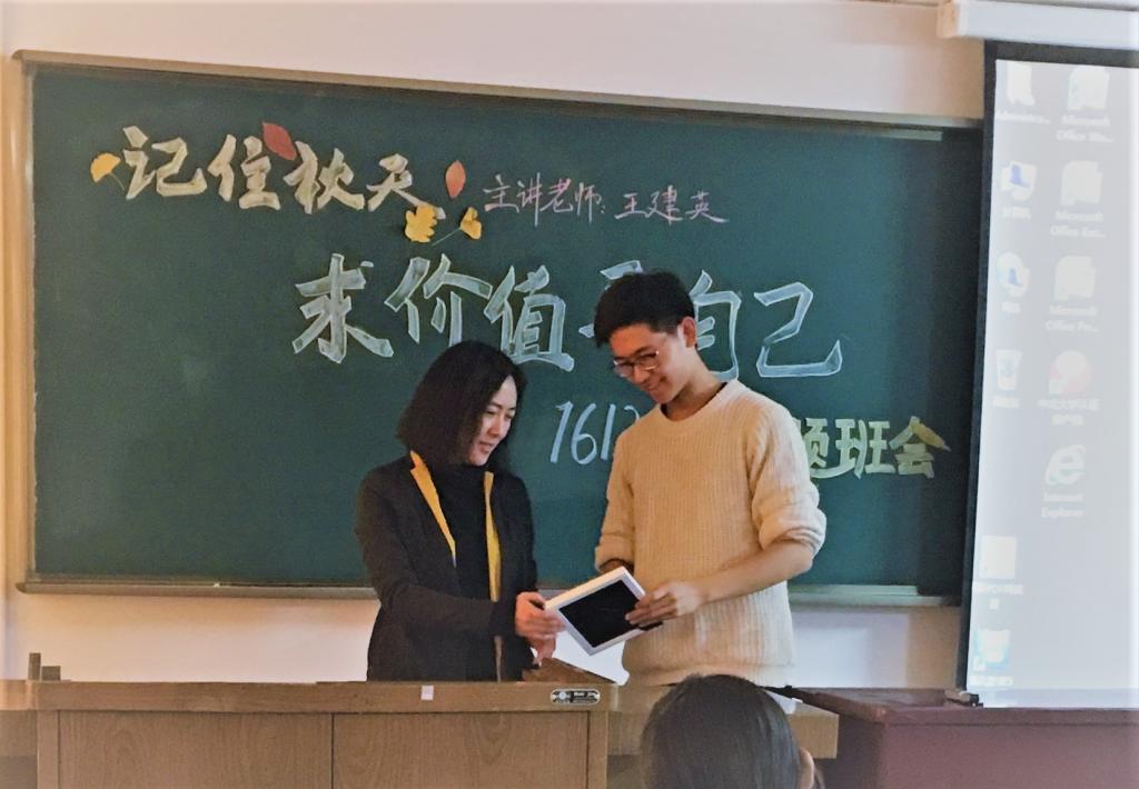 一个学期以来,王建英老师可谓同学们最喜欢的专业老师,也很感谢王建英老师能来做此次班会主讲嘉宾,内容也对我们启发很大,大学的四年里,我们会有目标,并且全力去实现,拥有正确的价值观,寻找到我们最真实的自己。由此,16120342“求价值,寻自己”主题班会圆满落幕,让我们一起记住这个秋天。