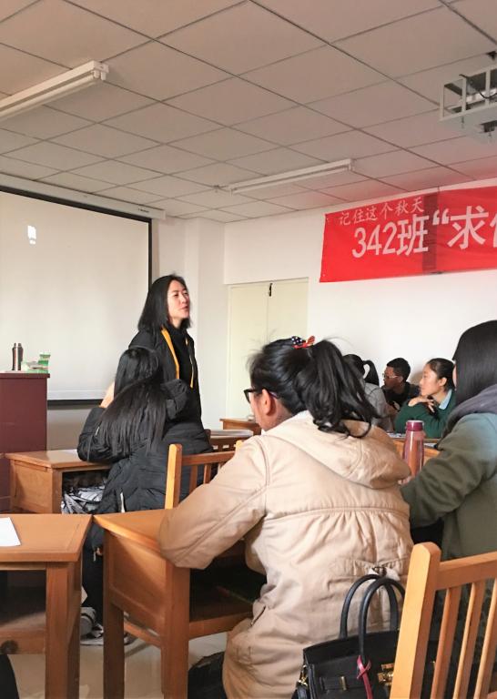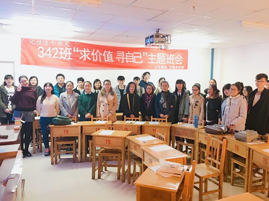 16120342班在16504成功举办了“求价值,寻自己”主题班会,班会邀请了专业老师王建英出席主讲嘉宾,16120342,16120341全体同学参加。让同学树立正确的价值观,寻找真正的人生意义,寻找自己。