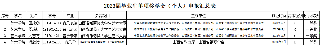 大学生奖学金评定实施细则》(校学字[2020]第11号)有关规定已评审结束。经个人申请——班级审核——学院审查,4人获得个人创新创业实践和竞赛奖学金。。现将名单公示在管网及文澜苑公示栏内,公示期3天,从2023年5月19日——21日。