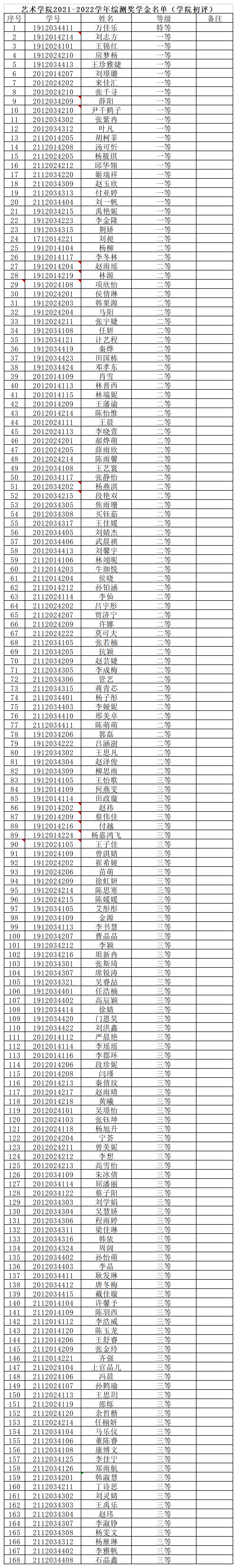 本科生奖学金评定实施细则(修订)》要求,经过学生自评、班级评议、学院评审等环节,现将我院2021-2022综合素质奖学金初审名单向全院师生员工公布,公示期三个工作日(2022.10.18-2022.10.20),望广大师生员工充分发挥民主监督的作用。学院公示名单里有不符合要求的自动取消并不做递补,奖学金最终名单以学生工作部(处)公示为准。若存在异议,请在公示期内及时反馈。