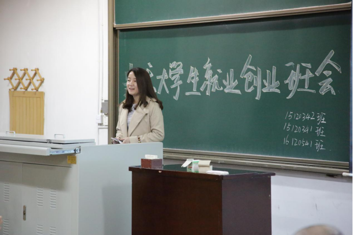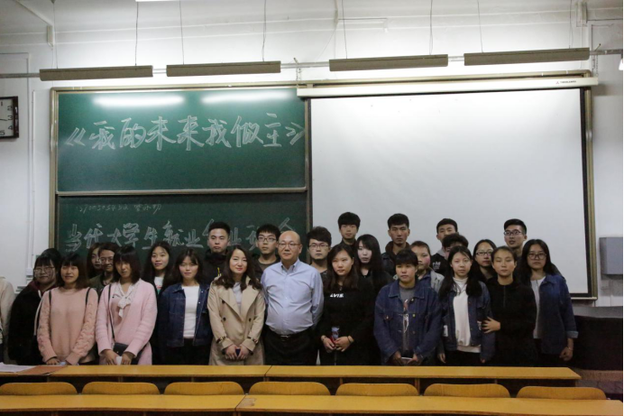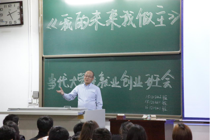 15120341、15120342、16120541班在12号楼301教室举办“我的未来我做主——当代大学生就业创业”主题班会,班会由班主任郭云老师主持。