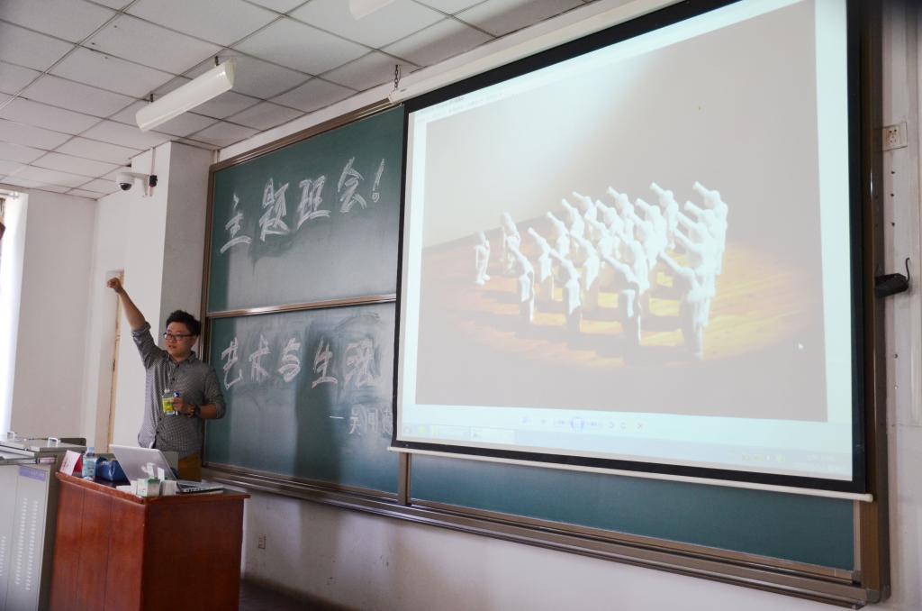 班会开始,吴老师首先向大家展示一些自己的作品并鼓励大家可以不受拘泥,大胆使用不同材质的材料制造作品并锻炼自己的动手能力。其后结合ppt用图片向大家展示了自己在研究生求学期间在澳洲大学的所闻所见所感,用自己的毕业作品向大家深入解释在创作时作品的含义及背景寓意。不论是油画作品“黄河”,环境作品“城市”还是几百个组合的泥偶都给我们留下了深刻的印象。