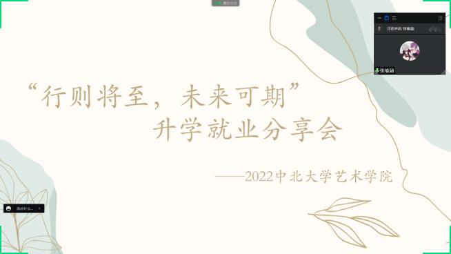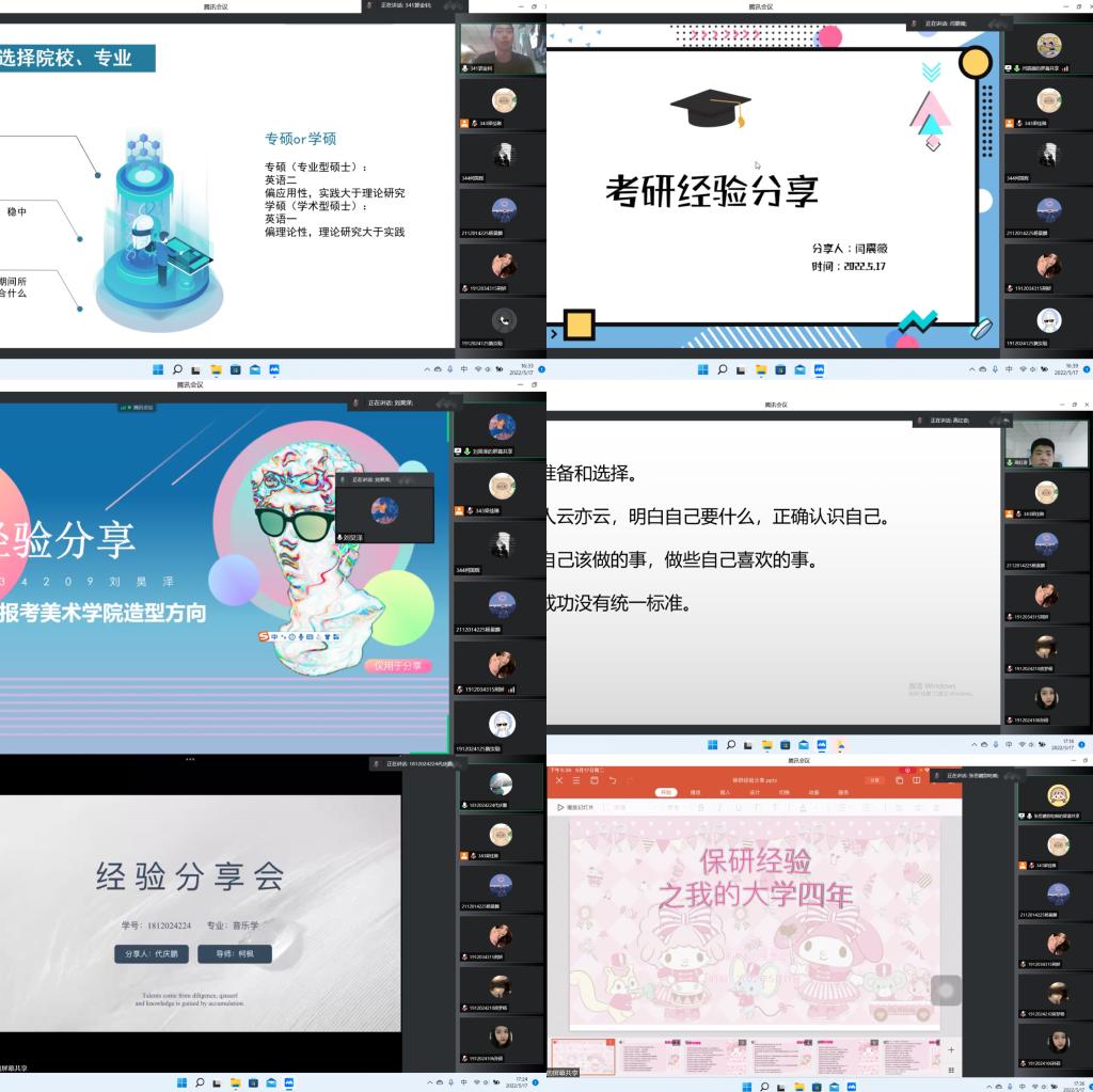 第一位分享者是郭金钊同学,他主要从如何选择院校、如何选择适合自己的专业等方面向同学们传授了一些比较实用考研经验;第二位分享者是闫震薇同学,她重点分享了考研经验,详细地向我们展示了考研的复习方向、资料及课程的选择、还有各科具体的学习方式,使同学们对考研细节有了更加清晰明确的认识;第三位分享者是刘昊泽同学,她讲述了视觉传达设计专业跨专业报考美术学院造型方向的内容,以及在缺乏自我管理能力下如何进入培训工作室在团队中学习的心得,她鼓励同学们要对奋斗目标保持信心,维持好自我心态起着十分重要的作用;第四位分享者是高红奇同学,他结合自己如何利用我校就业平台签约国企的经历,与大家分享了在就业的选择中怎样正确认识自己,明白自己要什么。生涯规划为何应从大一开始,最终如何写入简历;第五位分享者是代庆鹏同学,他向大家介绍了自己如何拿到网易音乐云实习offer在大厂实习的经历,以及在衡量职业发展与个人兴趣匹配度后又如何选择创业注册运营个人工作室“佑光音乐工作室”的心路历程;最后一位是张思邈同学,她通过对自己大学四年如何充实度过直至最终成功保研的讲述,提醒同学们要注意大学专业学习与社会实践相结合,向大家传递着积极向上的学习与社会实践态度。