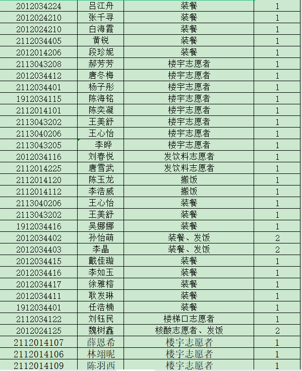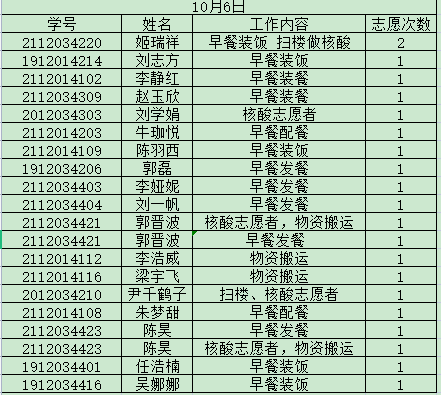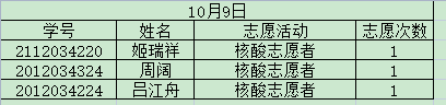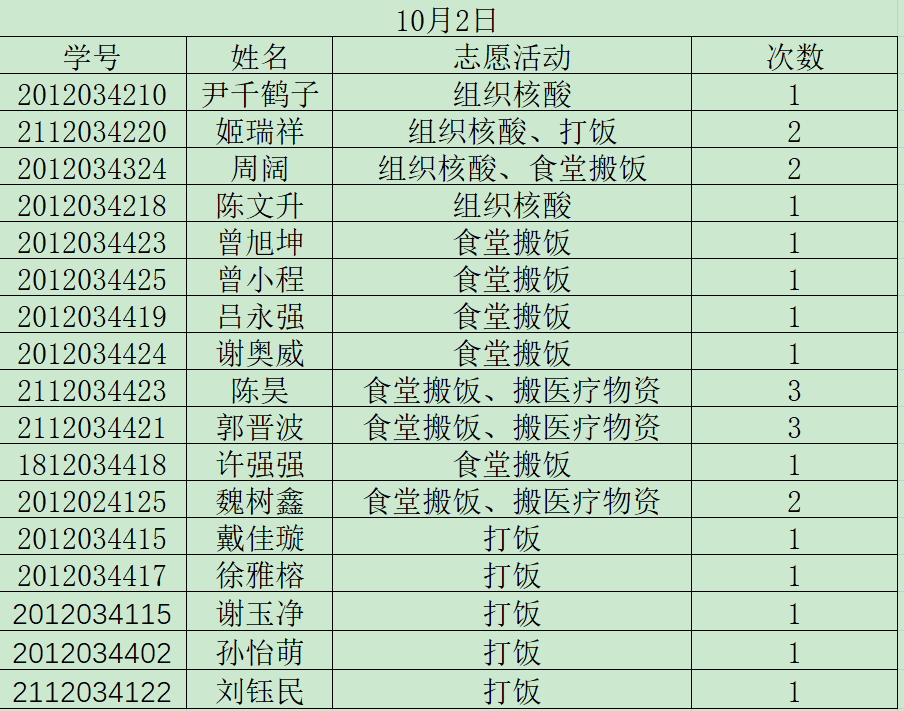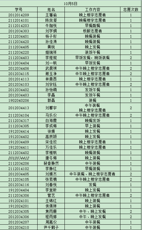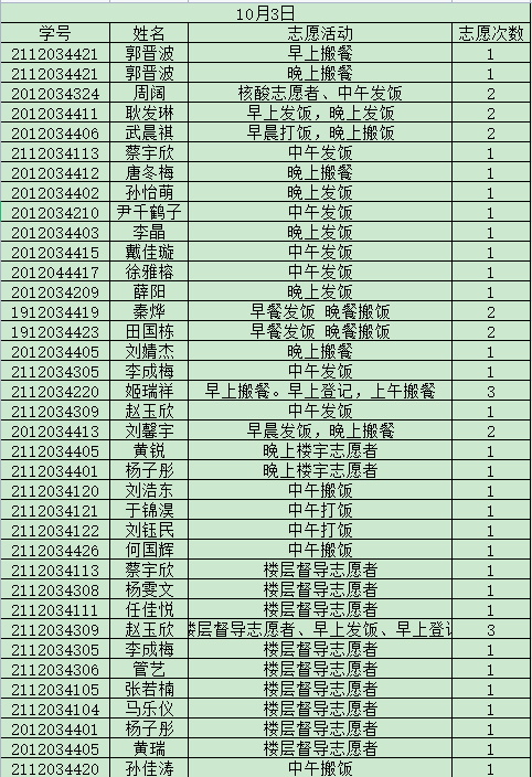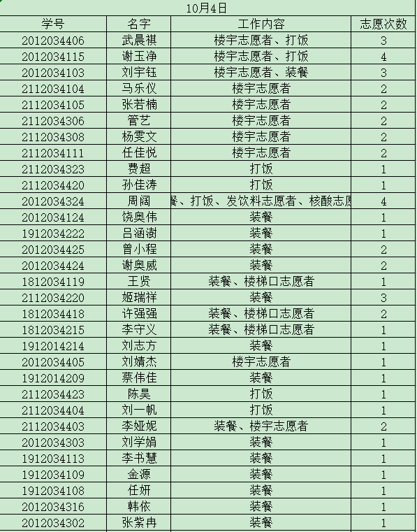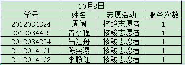 为了更好的推进我院志愿者服务工作,做到志愿者服务工作公开化,透明化。学院将根据志愿者服务工作具体项目和志愿者服务情况,每期对参与名单进行公示。现将10月静态管理期间志愿服务参与名单予以公示,公示期五天。有异议者,请在10月18日18点前与学生会办公室吴慧娇联系。