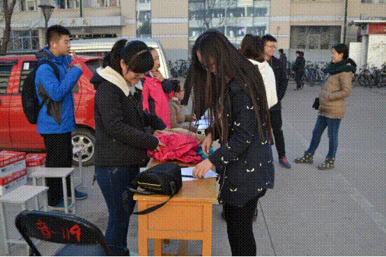 2015年十二月五日上午10:30,我校院实践青志部在田园食堂门口进行为期五个小时的爱心捐衣活动。本次活动旨在帮助无衣儿童更好的度过寒冬。